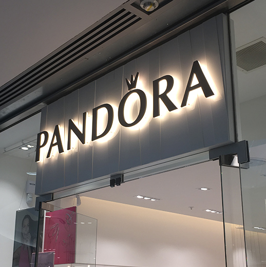 Jonsigns have worked closely with Pandora, and have fitted everything from illuminated external signage, window vinyl’s and bespoke internal signage.