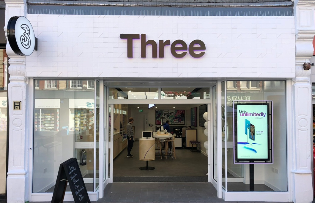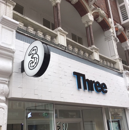 Jonsigns has been responsible for the manufacturing and installation of numerous Three stores across the UK. We have worked closely with Three and their design team and architects to manufacture their internal brand graphics and fascia signage which included RGB colour changing halo illuminated letters, suspended acrylic light boxes and creative internal graphics to suit their new brand image.